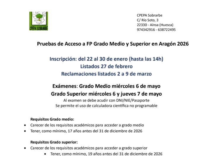 Notificamos que ya está abierto el plazo de matrícula para las pruebas de acceso de FP Grado Medio y Superior en Aragón.